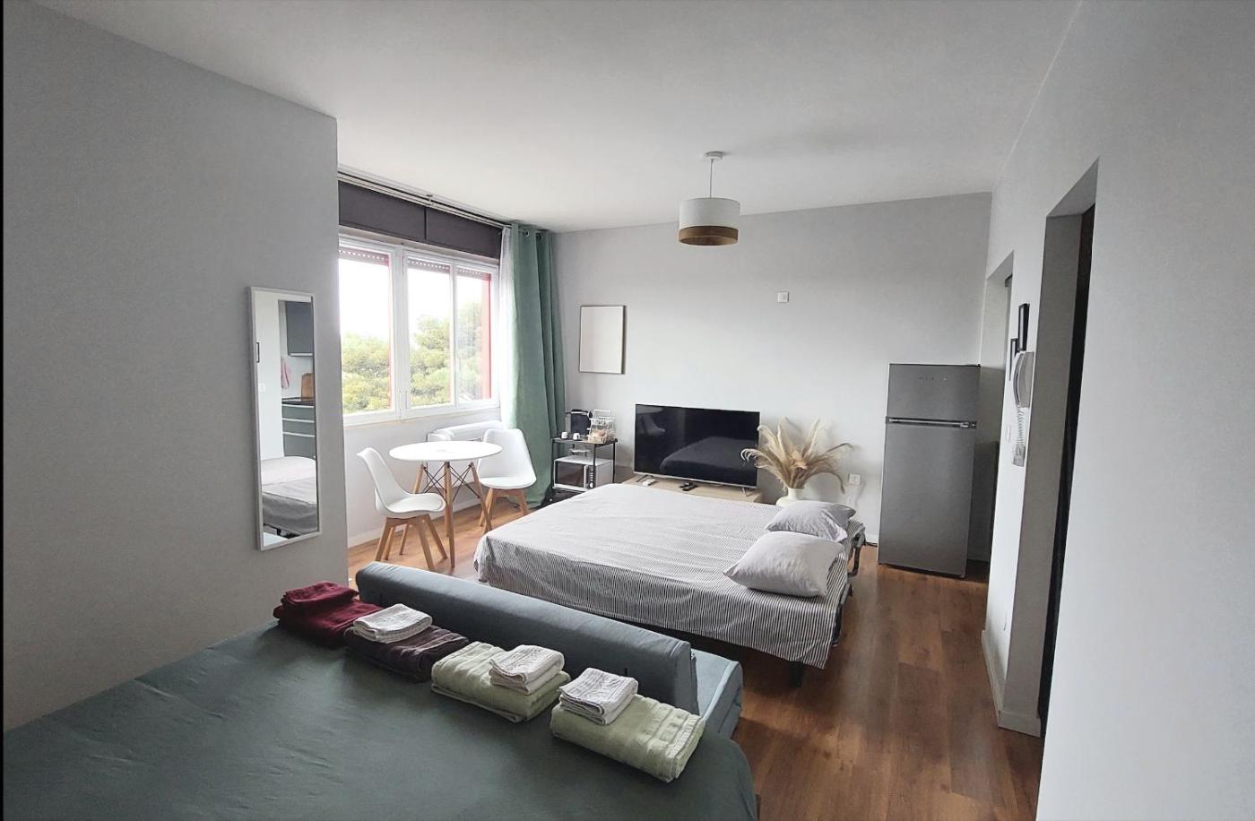 One-Bedroom Apartment. This apartment comes with 1 living room, 1 separate bedroom and 1 bathroom with a hairdryer and free toiletries. In the well-fitted kitchen, guests will find a stovetop, a refrigerator, kitchenware and a microwave. The air-conditioned apartment features a flat-screen TV with cable channels, a washing machine, a tea and coffee maker, a seating area as well as city views. The unit has 2 beds.